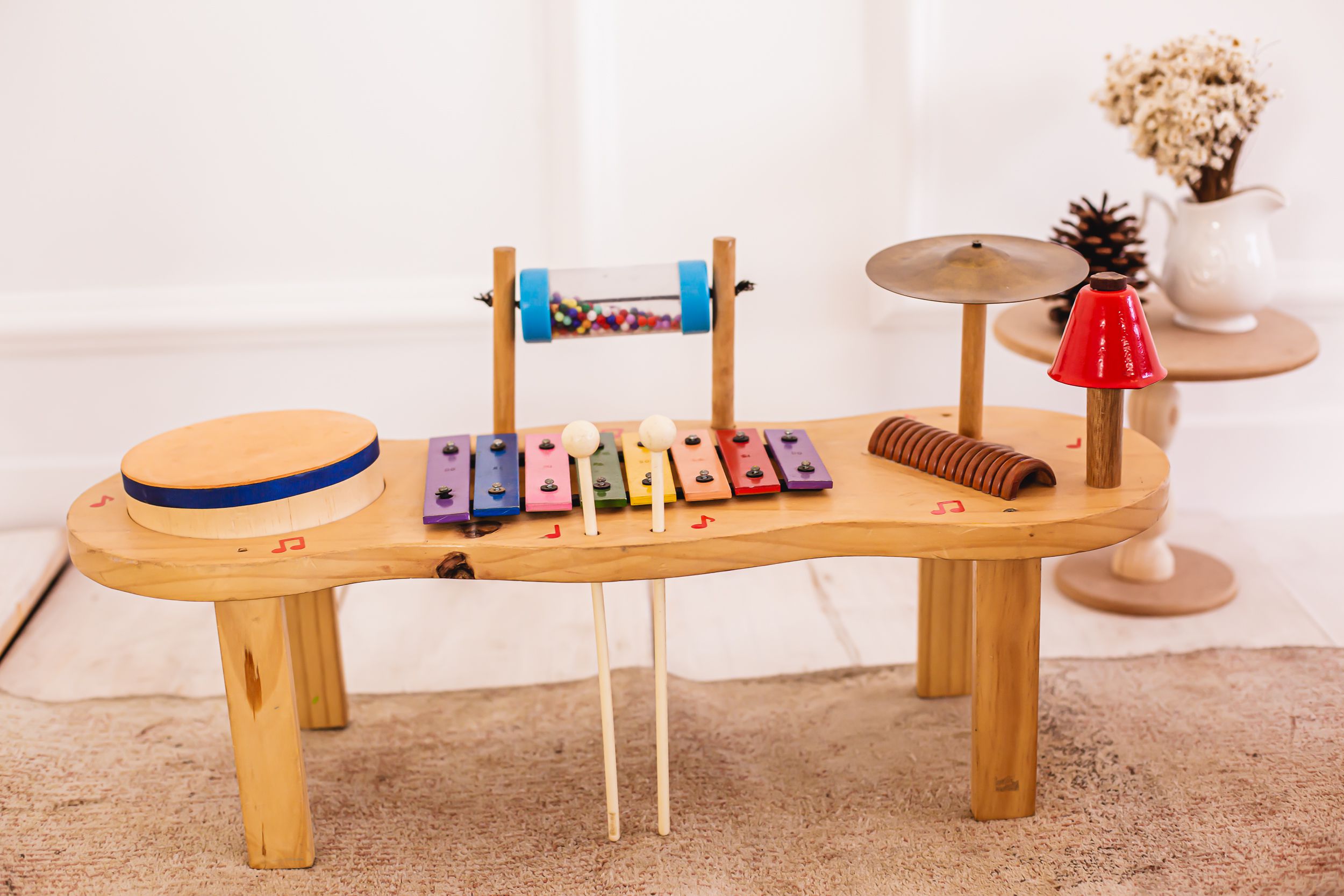 Multi-Instrumento para alegria da criança - 01 Metalofone 8 teclas coloridas afinadas ( Do á Do ) natural - 01 Prato - 01 reco-reco - 01 sininho - 01 ganza cristal com bolinhas coloridas - 01 tambor com pele em madeira/EVA - 02 baquetas