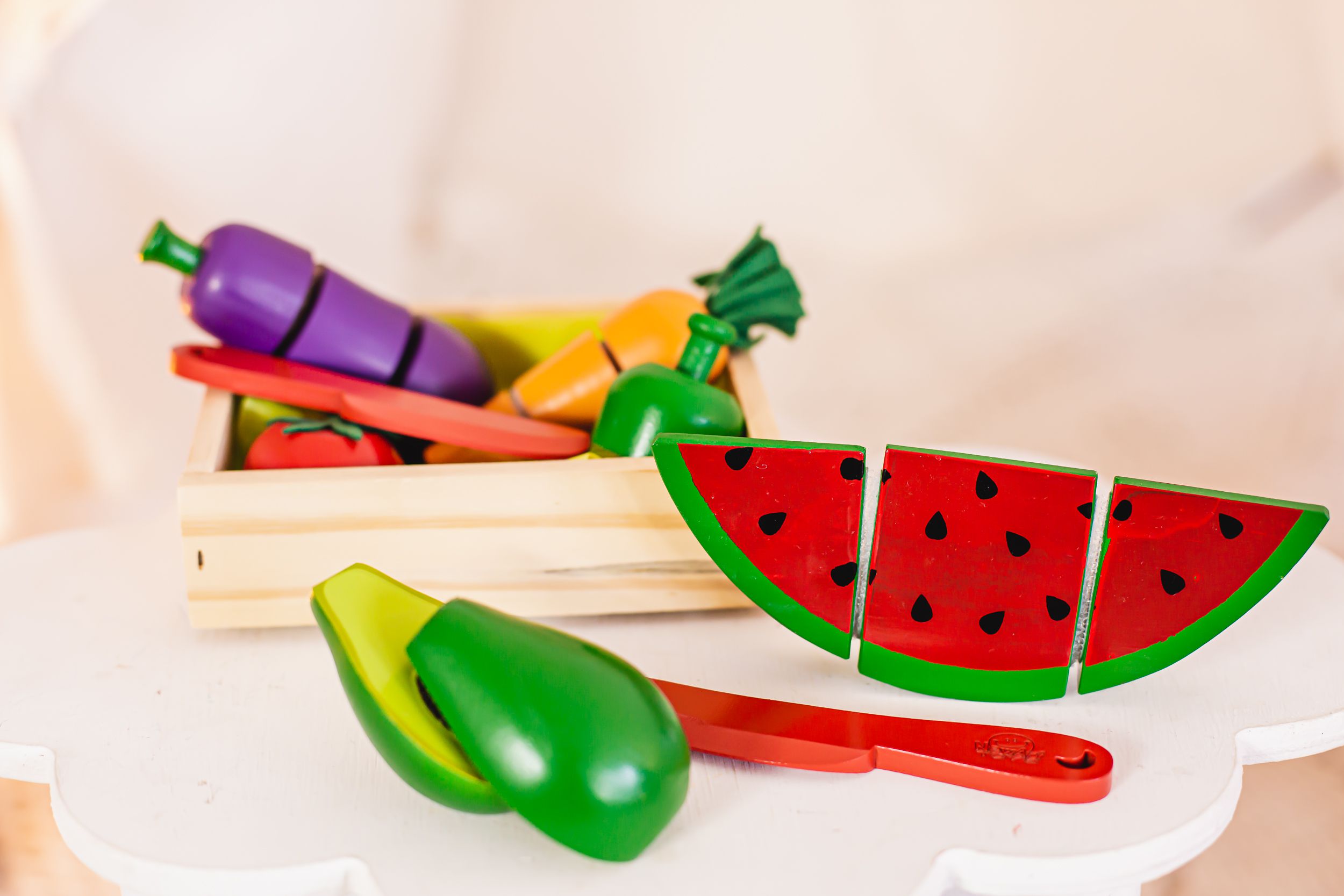 Este kit contém: 2 peças - 01 abacate com corte e 01 fatia melancia com corte e 01 faca sem ponta em madeira.