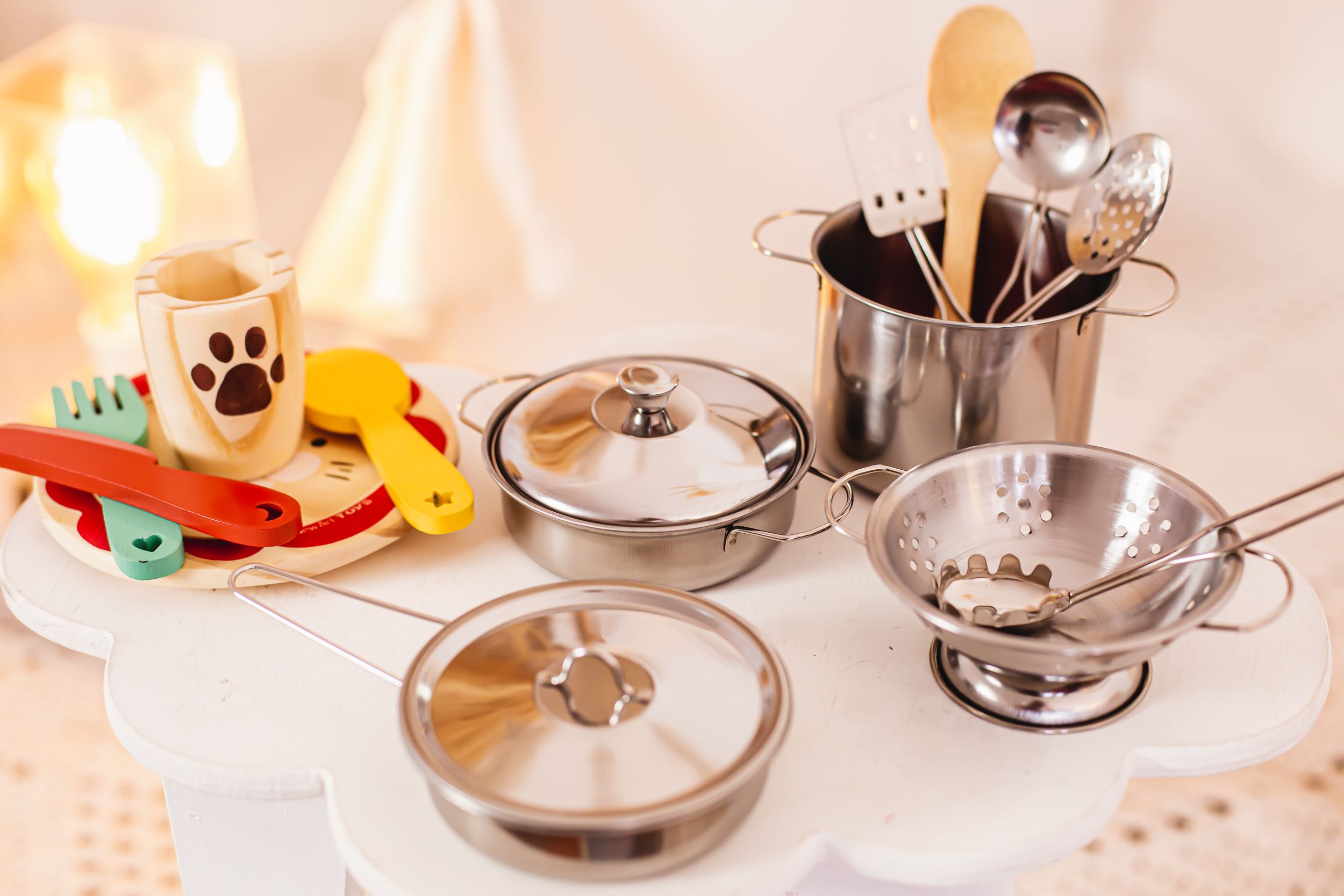 Kit de panelinhas inox contendo 12 peças, sendo 4 panelinhas, 2 tampas, 4 utensílios inox, 1 utensílio de madeira, 1 pano de prato.