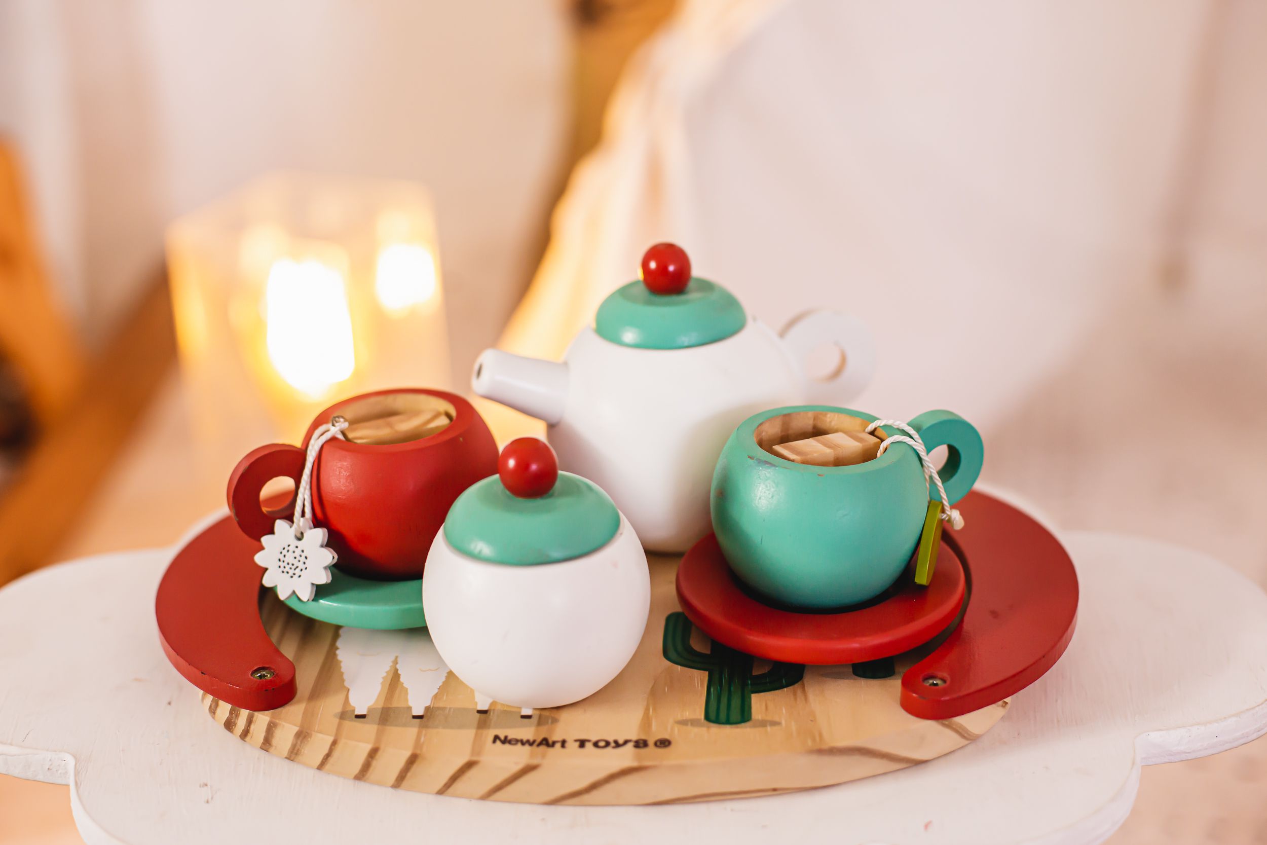 Kit chá contendo 2 xícaras, 2 pires, 1 açucareiro, 1 bule, 2 sachês de chá e 1 porta xícara de lhama.